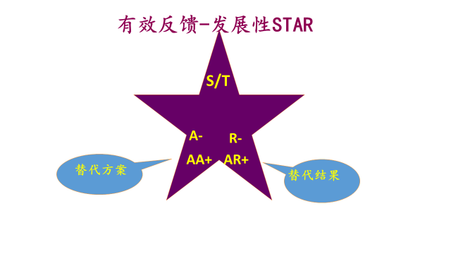 发展性反馈,是指当学员再现的行为脱离设定标准时,呈现的STAR为负性STAR。这时,培训师必须及时干预,引导学员回顾目标,再次展现匹配的行为,取得设定的结果。